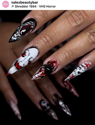 VALERIE: Oh, Halloween is my season. I love when everyone gets creative and festive — it’s pure art energy. Lately I’ve been doing a lot of freestyle nail sets, which are my absolute fave during spooky season. My inspo comes straight from Instagram and TikTok — I’ll be up late doom scrolling like, “Wait, what if I mix chrome with a ghost French tip?”